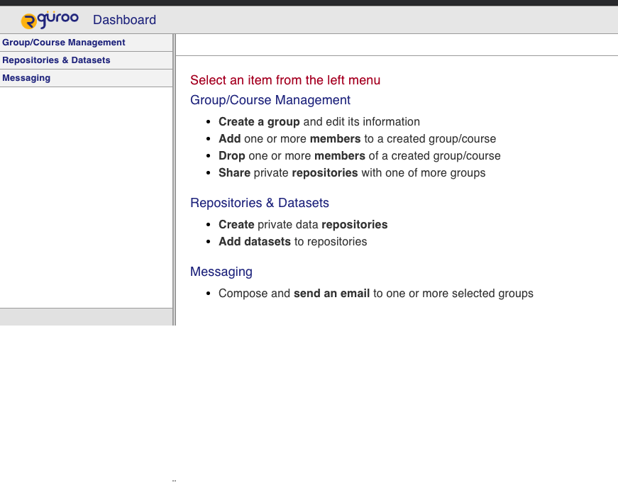 Create data repositories, including the description of the datasets, to share with your students or any other Rguroo User.